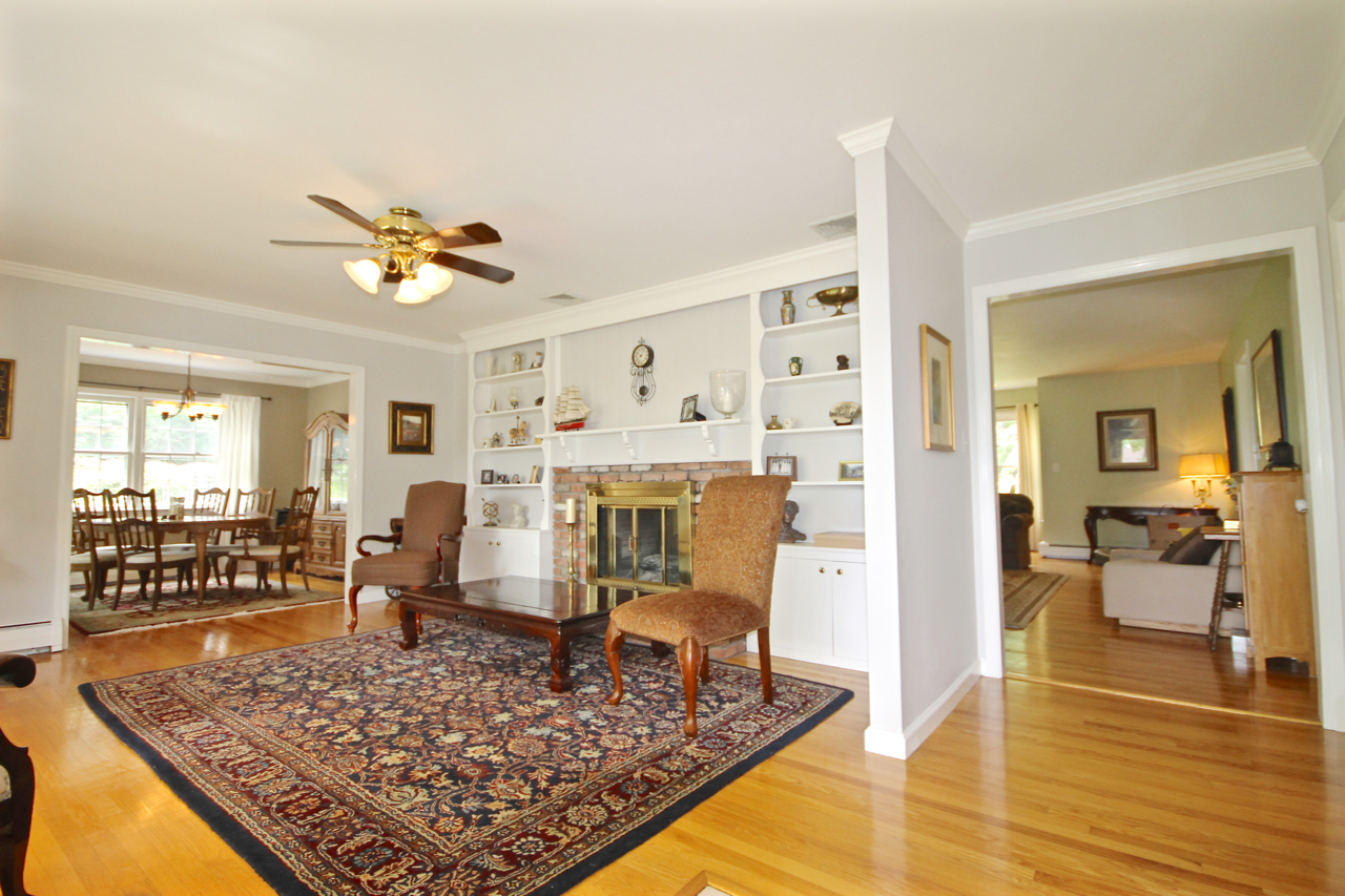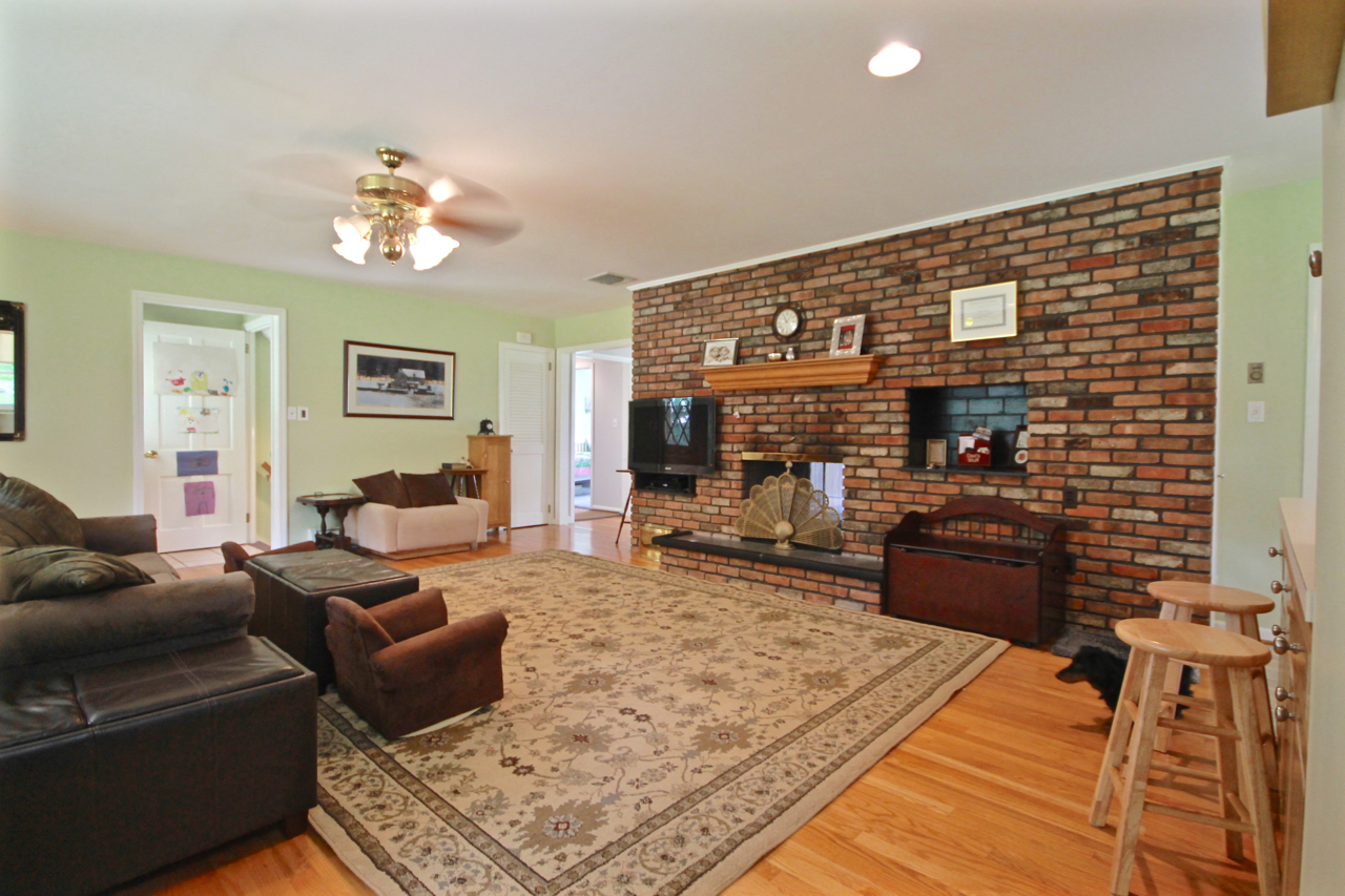 This family room is huge! Check out that massive hearth, complete with hand crafted cabinetry built-ins and a double sided gas fireplace!
