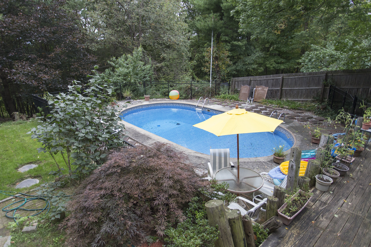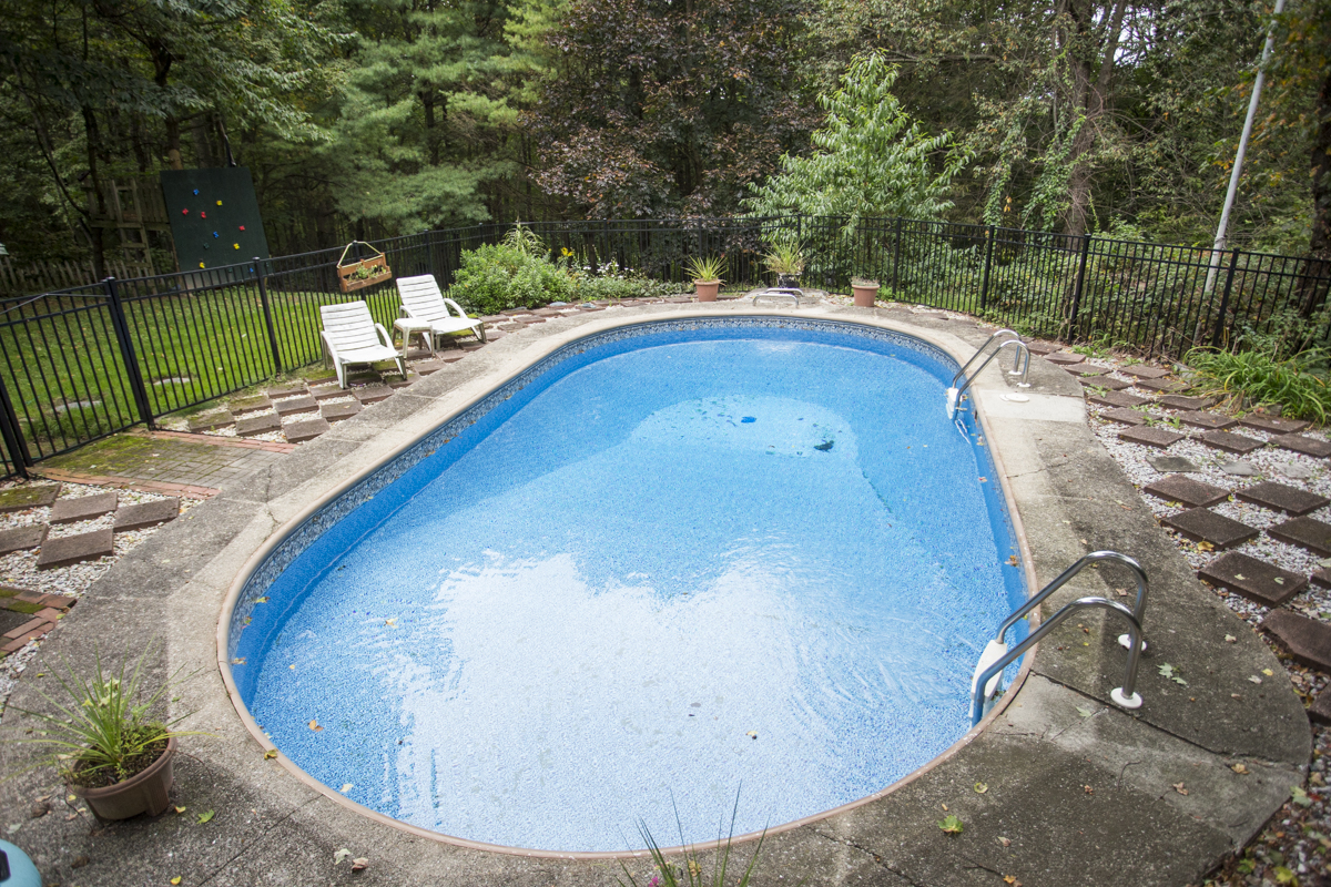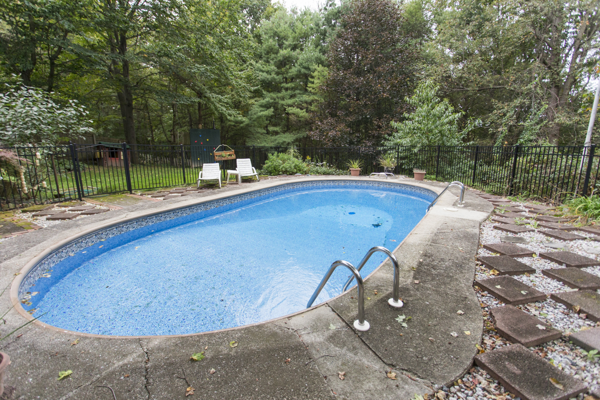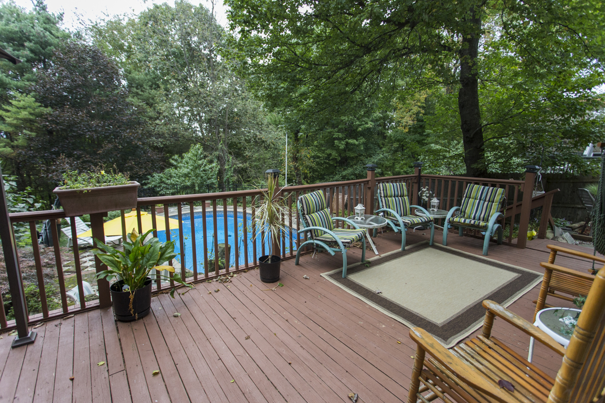 The spacious deck is accessed from the backyard or through sliding doors on the main level of the home. This awesome outdoor space overlooks the utterly refreshing in-ground pool (with new liner!) and is surrounded by trees, providing a great buffer and tons of privacy.