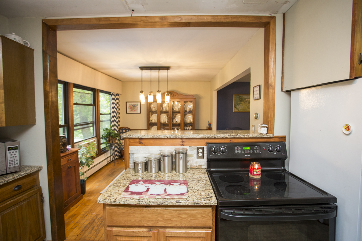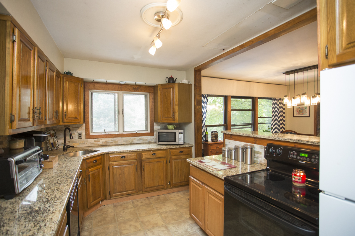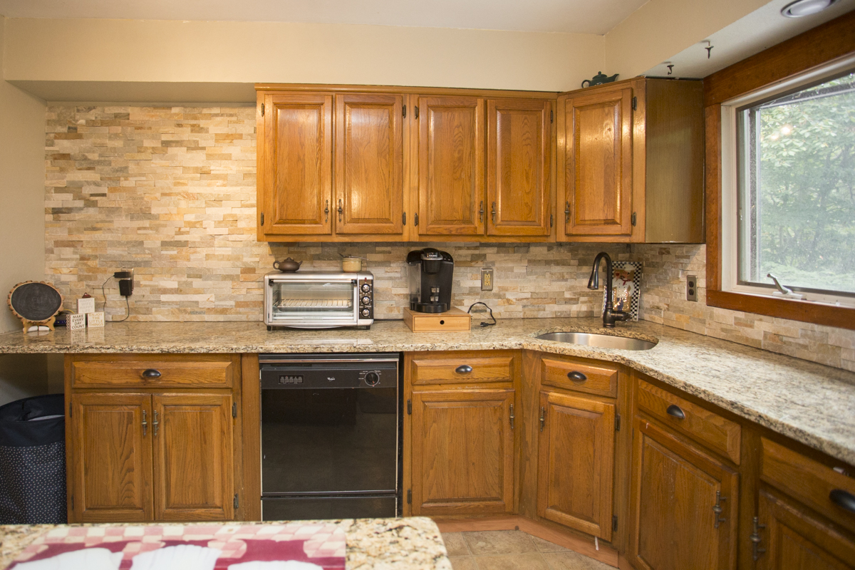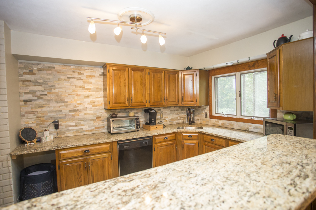 The recently updated kitchen has glowing granite countertops and a really cool stone backsplash.