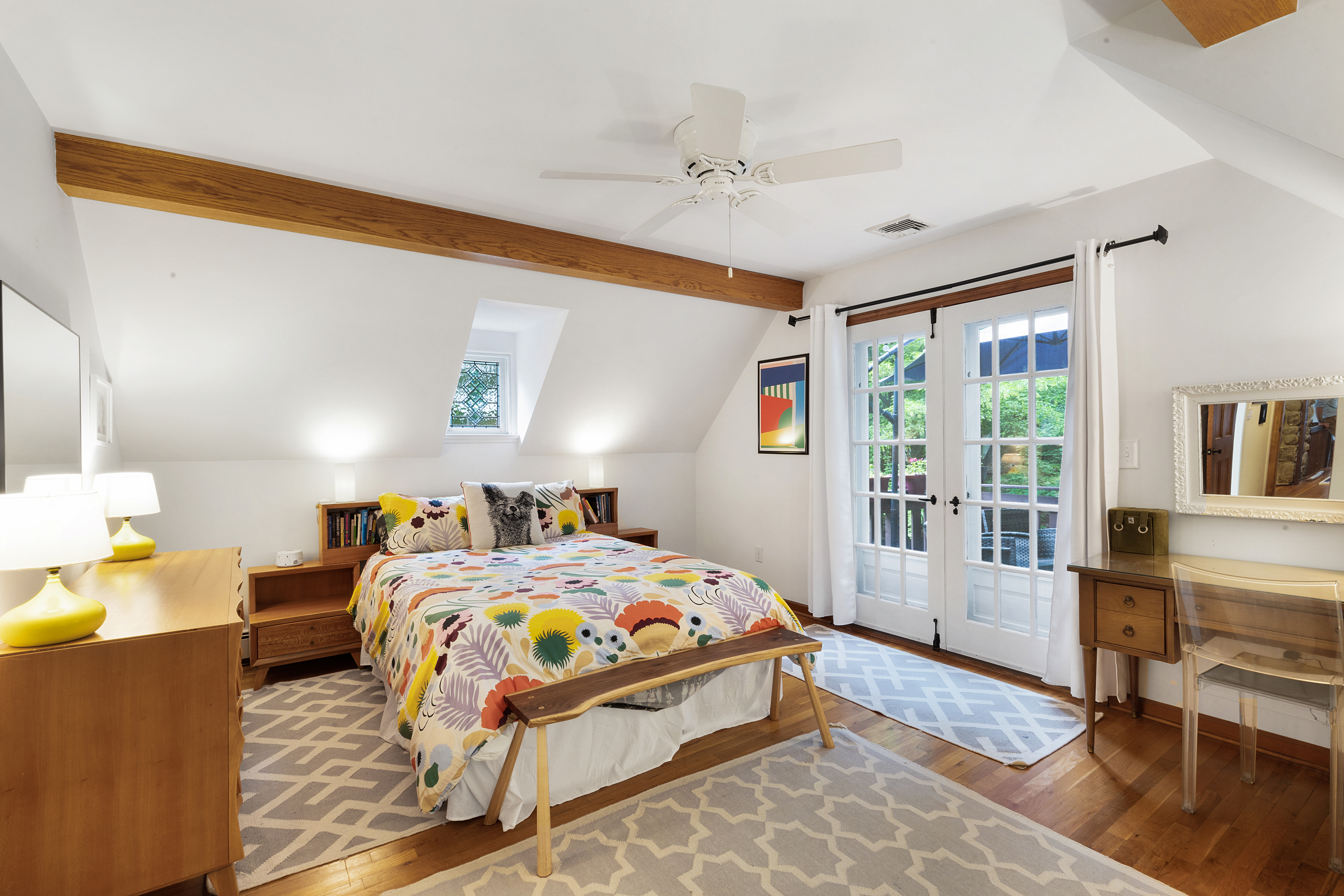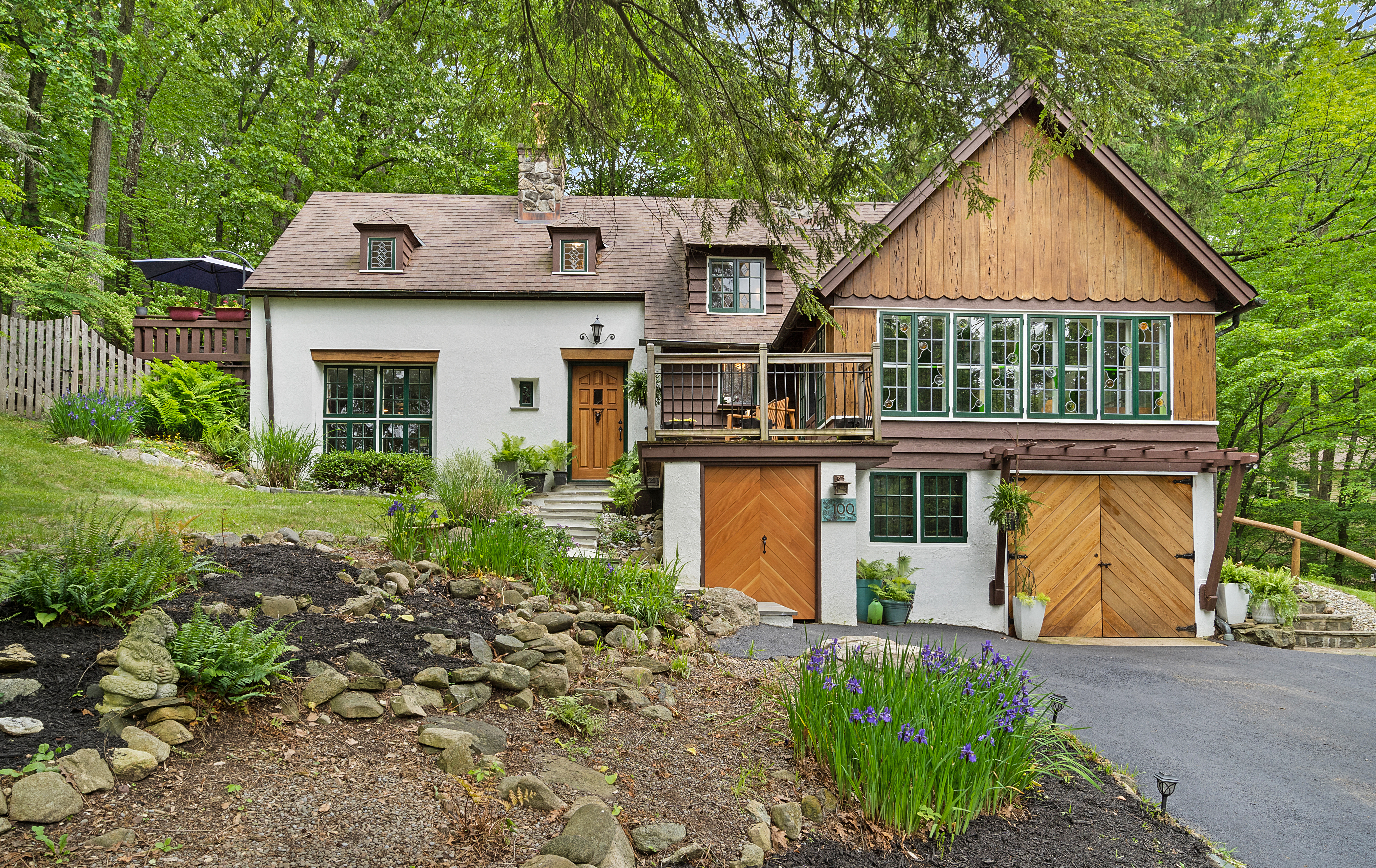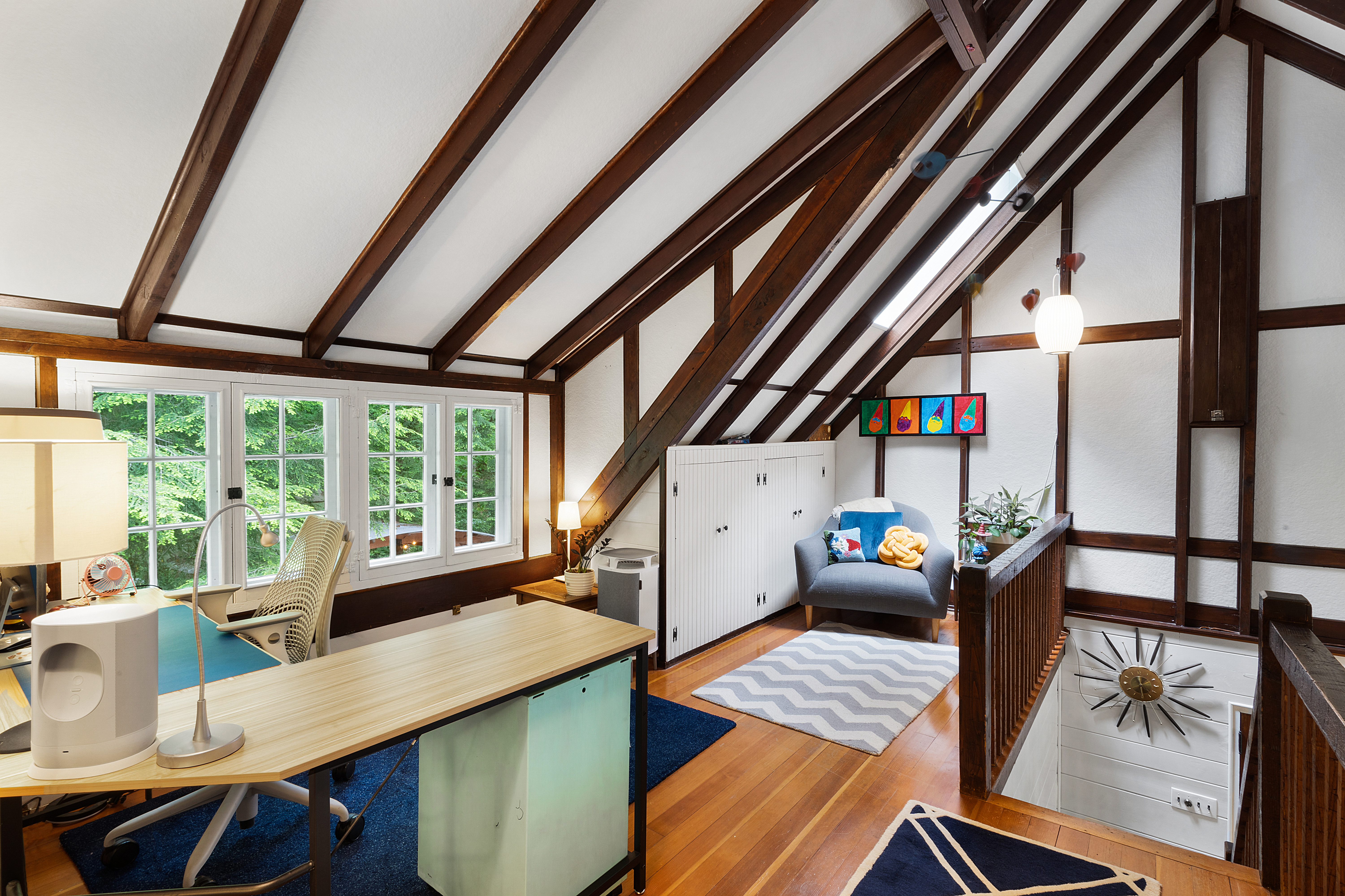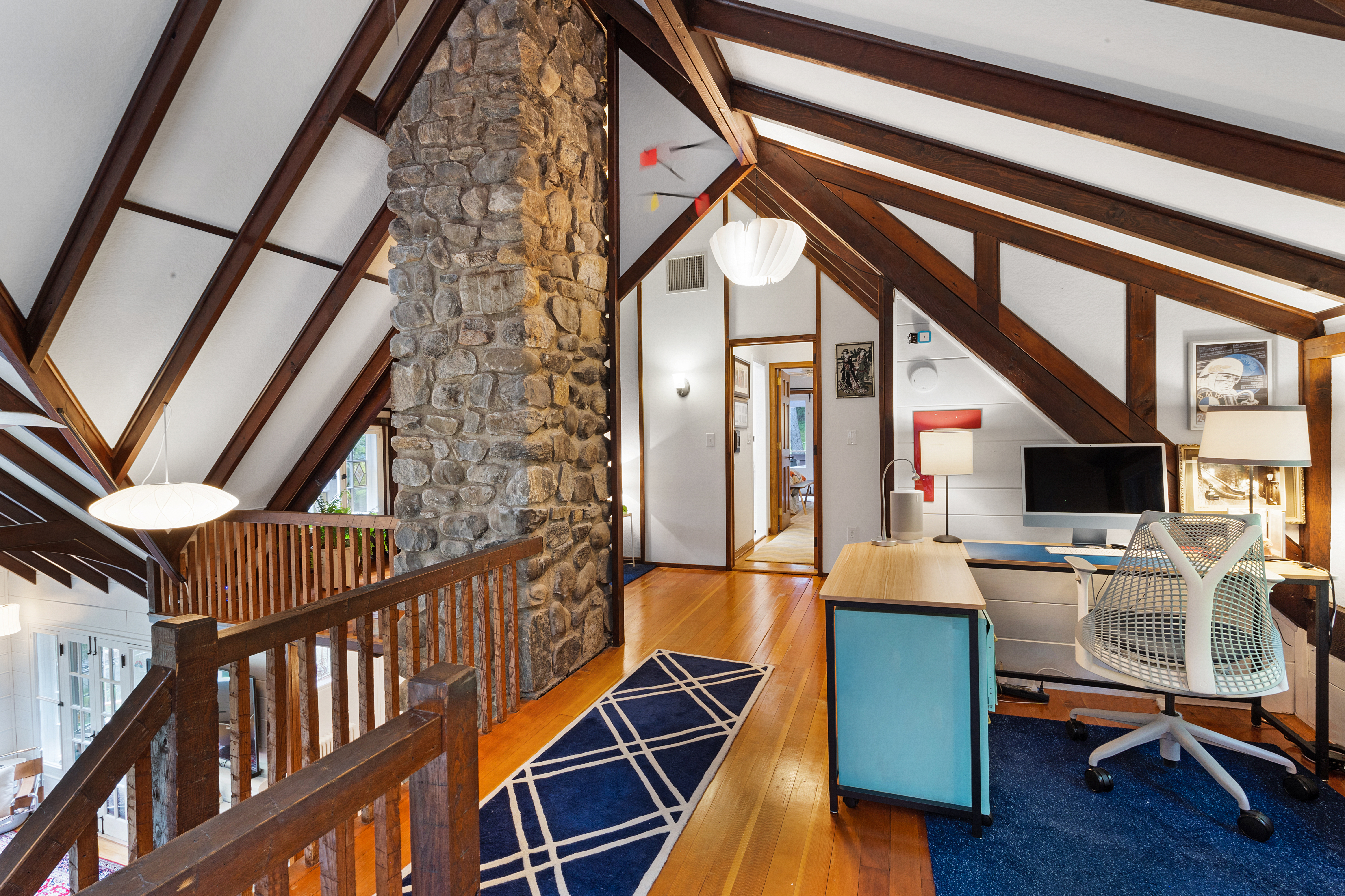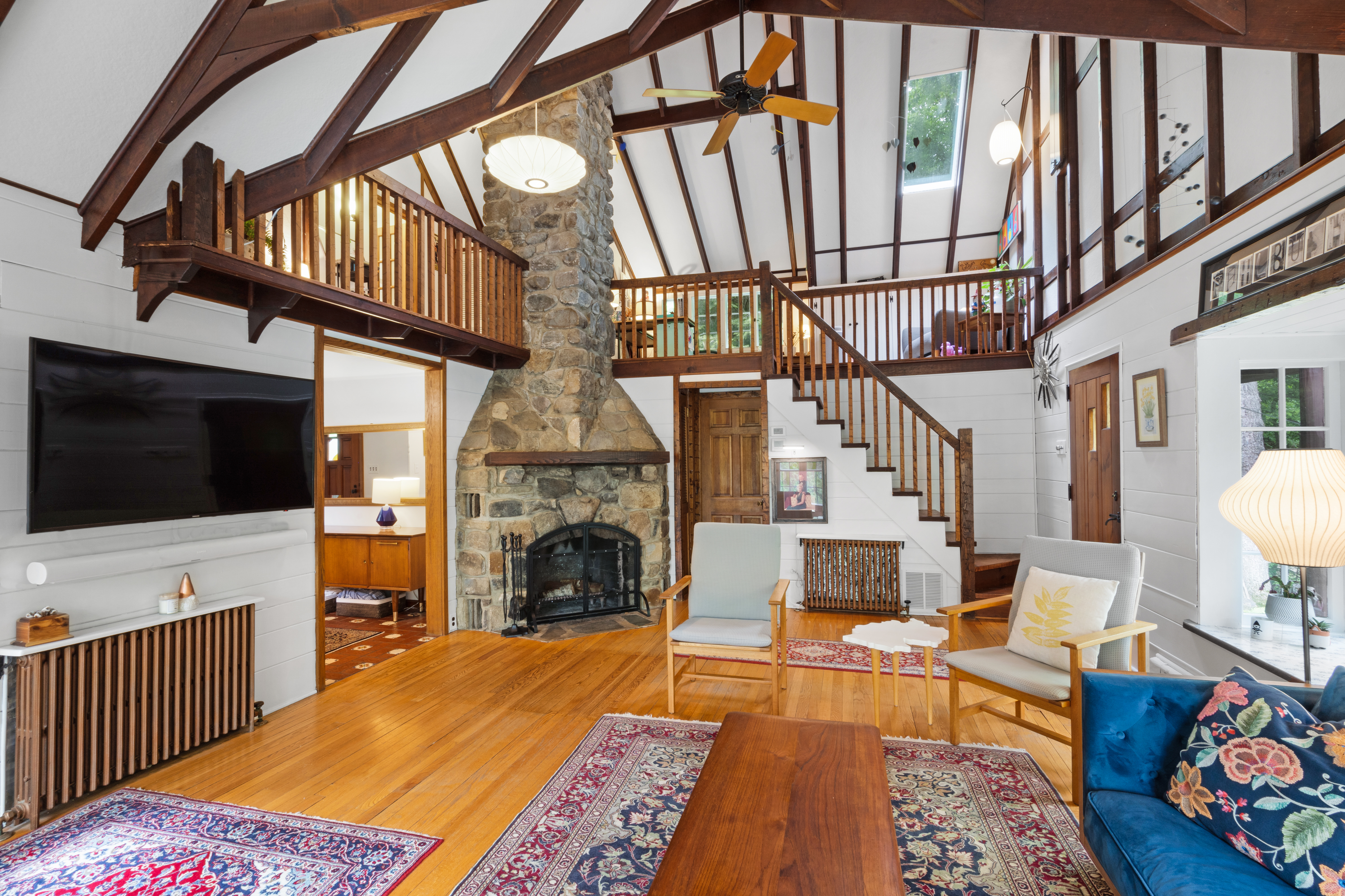 Inside you’ll find a functional layout w/ a recently updated kitchen featuring upgrades like quartz countertops, stainless appliances, two ovens, two sinks, induction cook & vintage Morsø wood stove! Various artisan tile used throughout the entry foyer, kitchen and dining room make for quite the captivating environment! French doors off of the kitchen lead to the first bedroom, offering built-in storage solutions and a charming window seat. The living room is the remarkable crown jewel of this home, featuring a two-story original stone fireplace, vaulted/beamed ceilings and an array of vintage windows w/ stained glass complimenting the lush green views to the outside world. Bedroom 2 and a fully updated bathroom complete the first level. The open wood staircase leads to a functional office loft with original pine floors. Private primary bedroom w/ deck, full updated bathroom, walk-in closet in the hall.