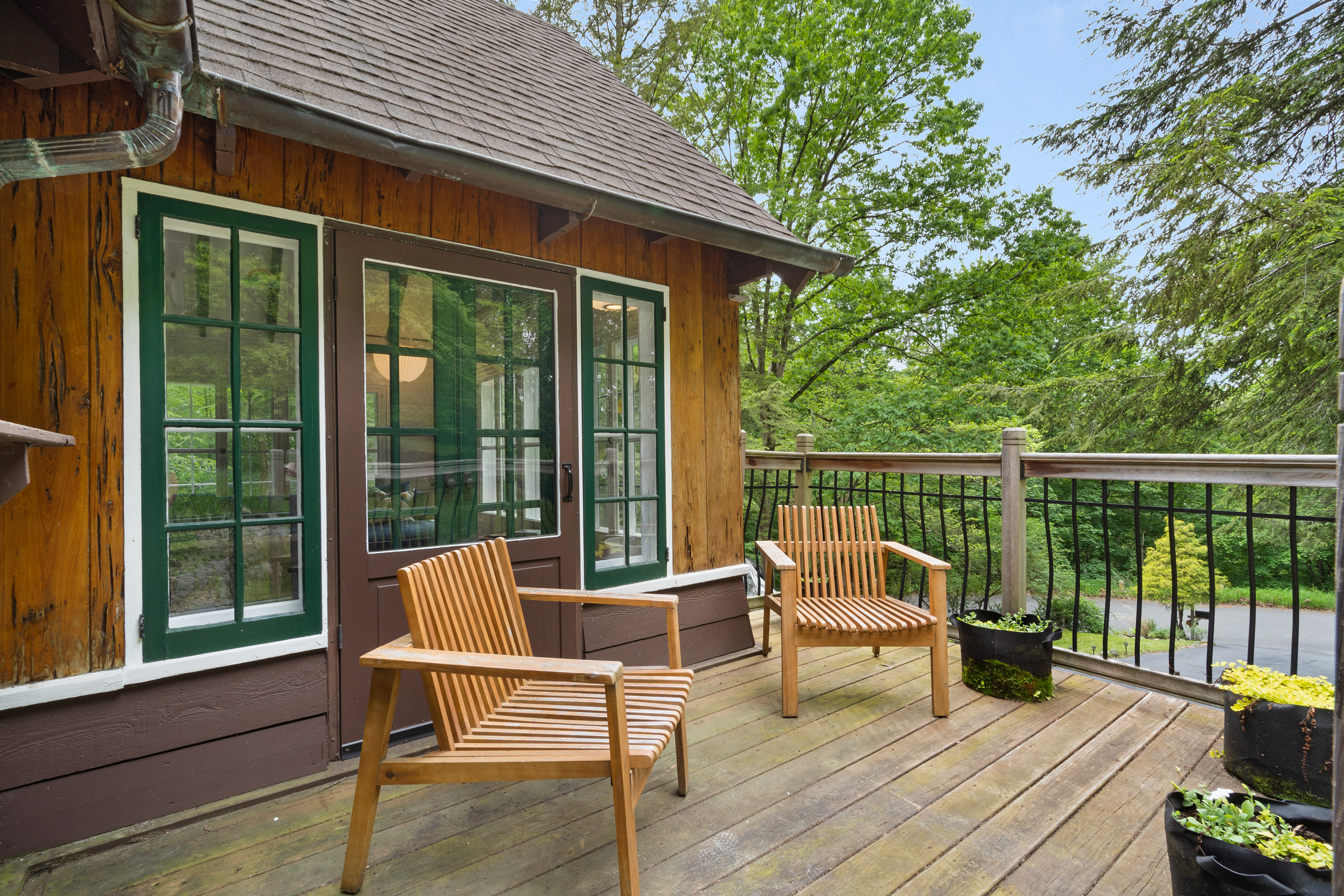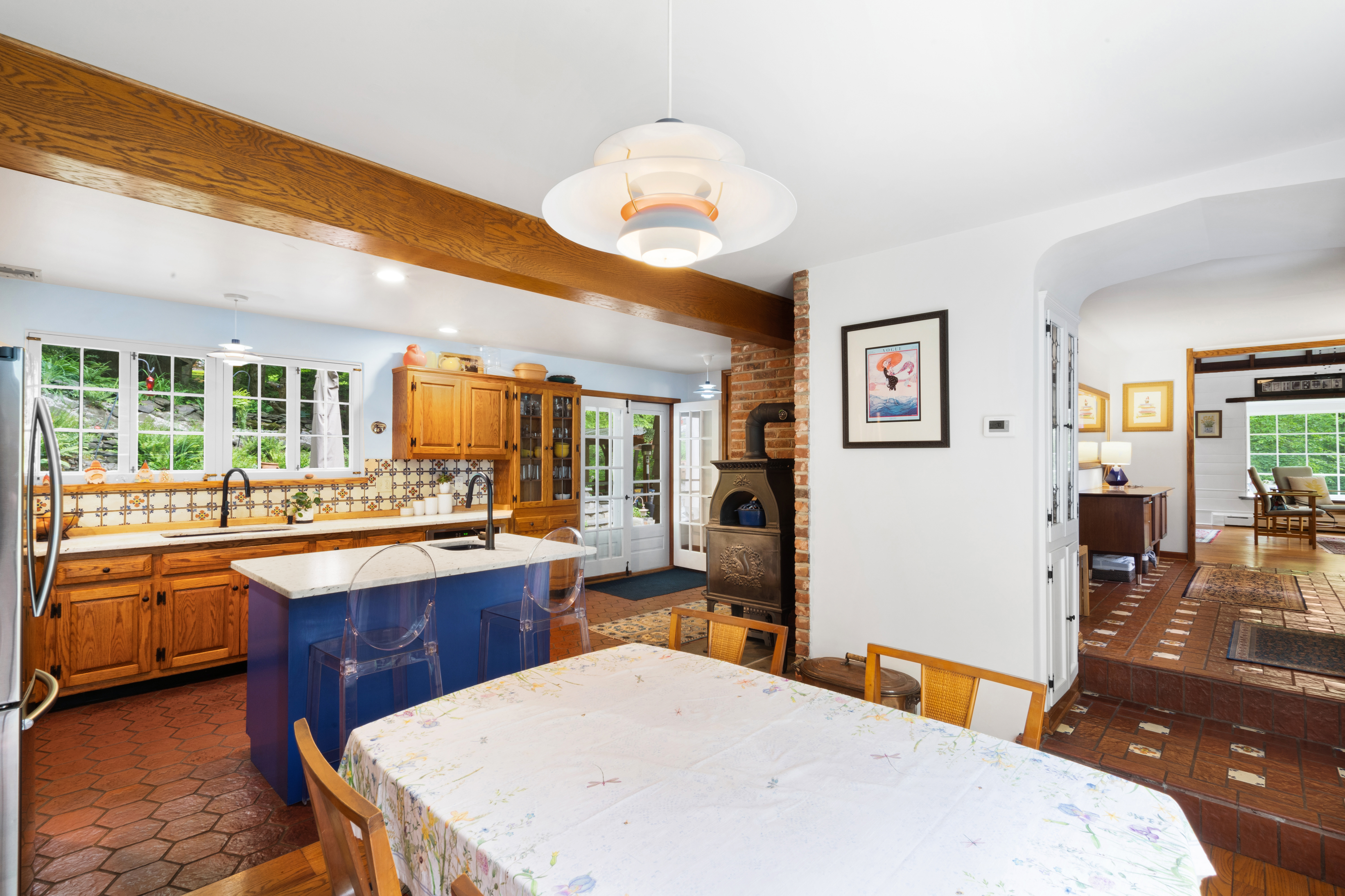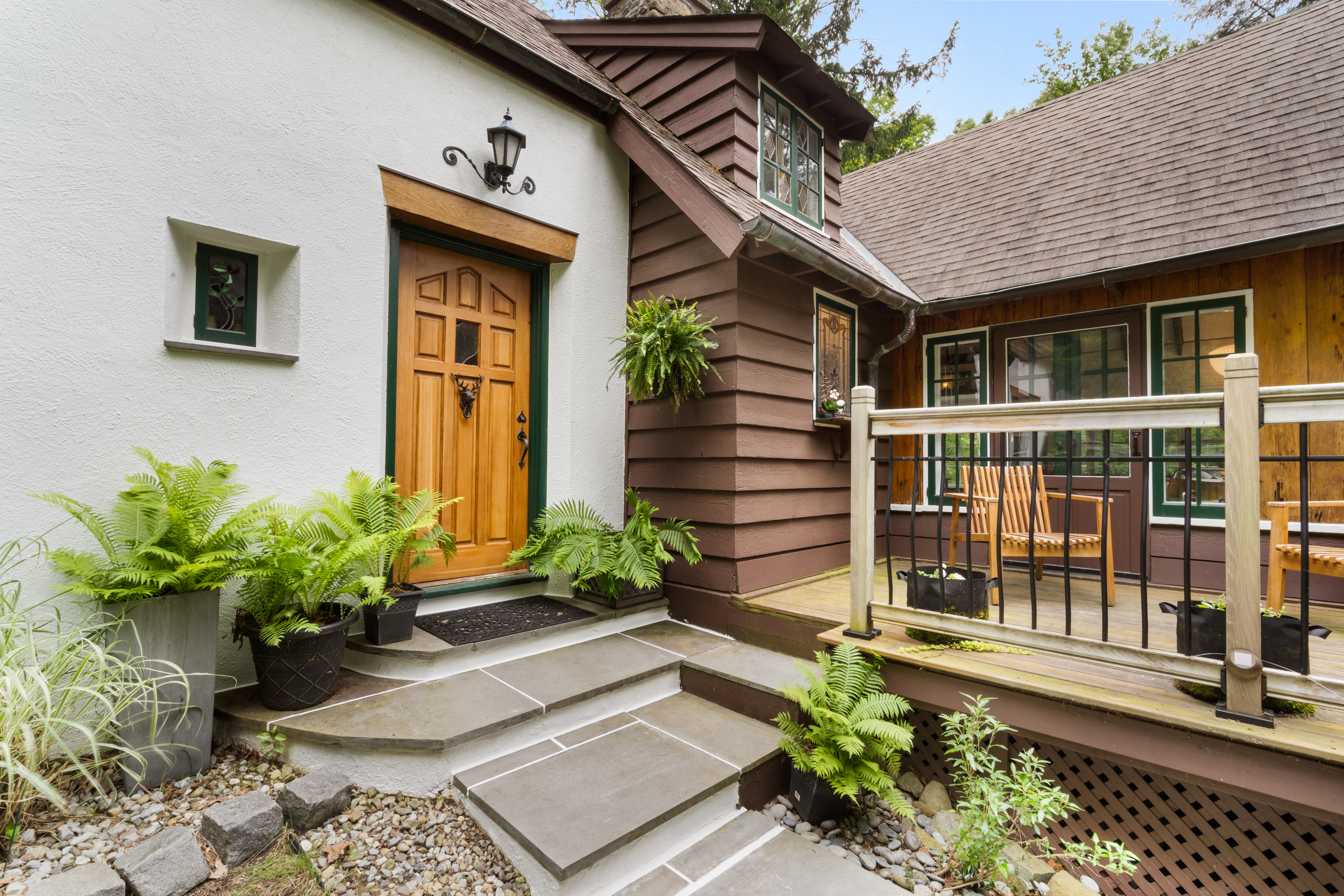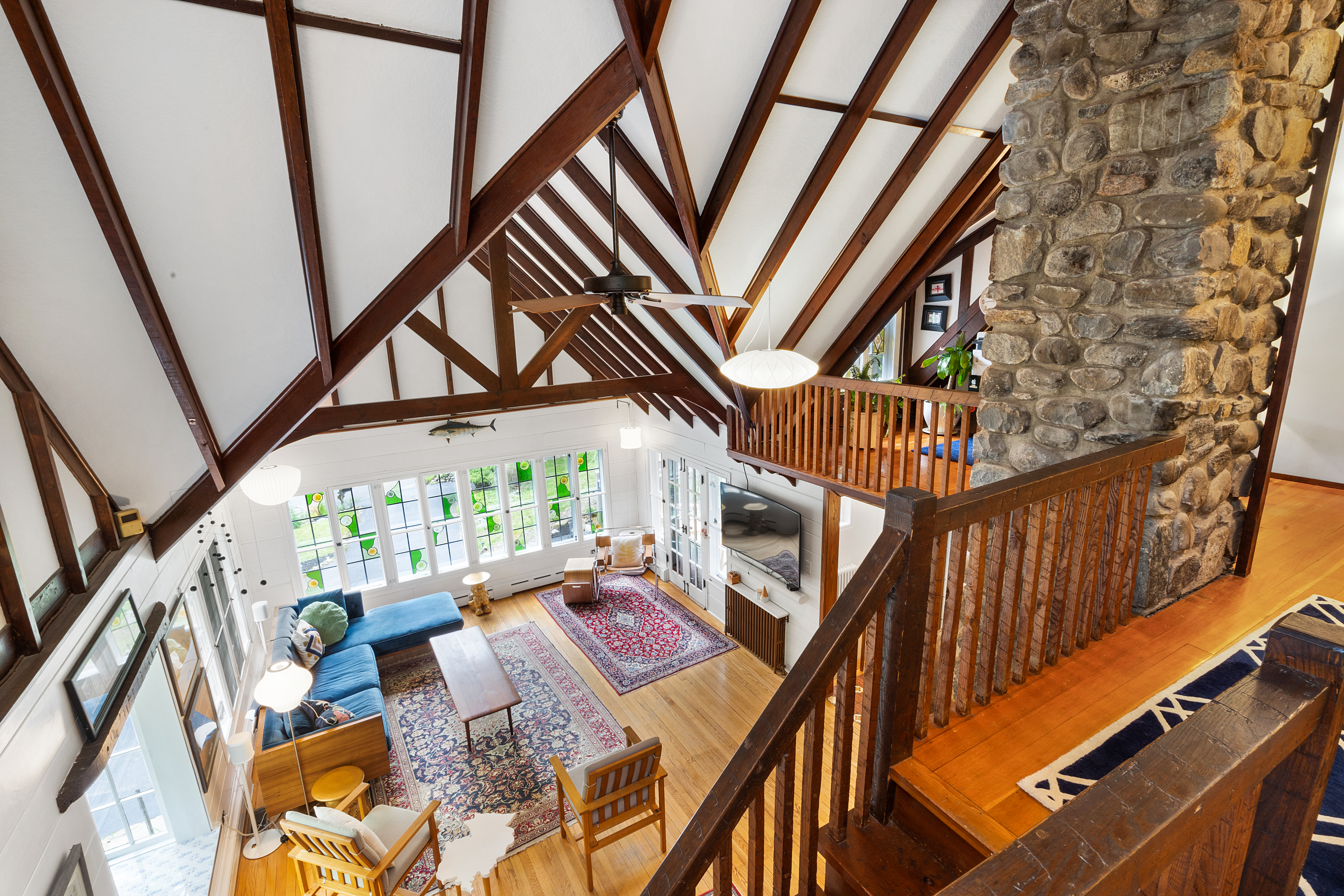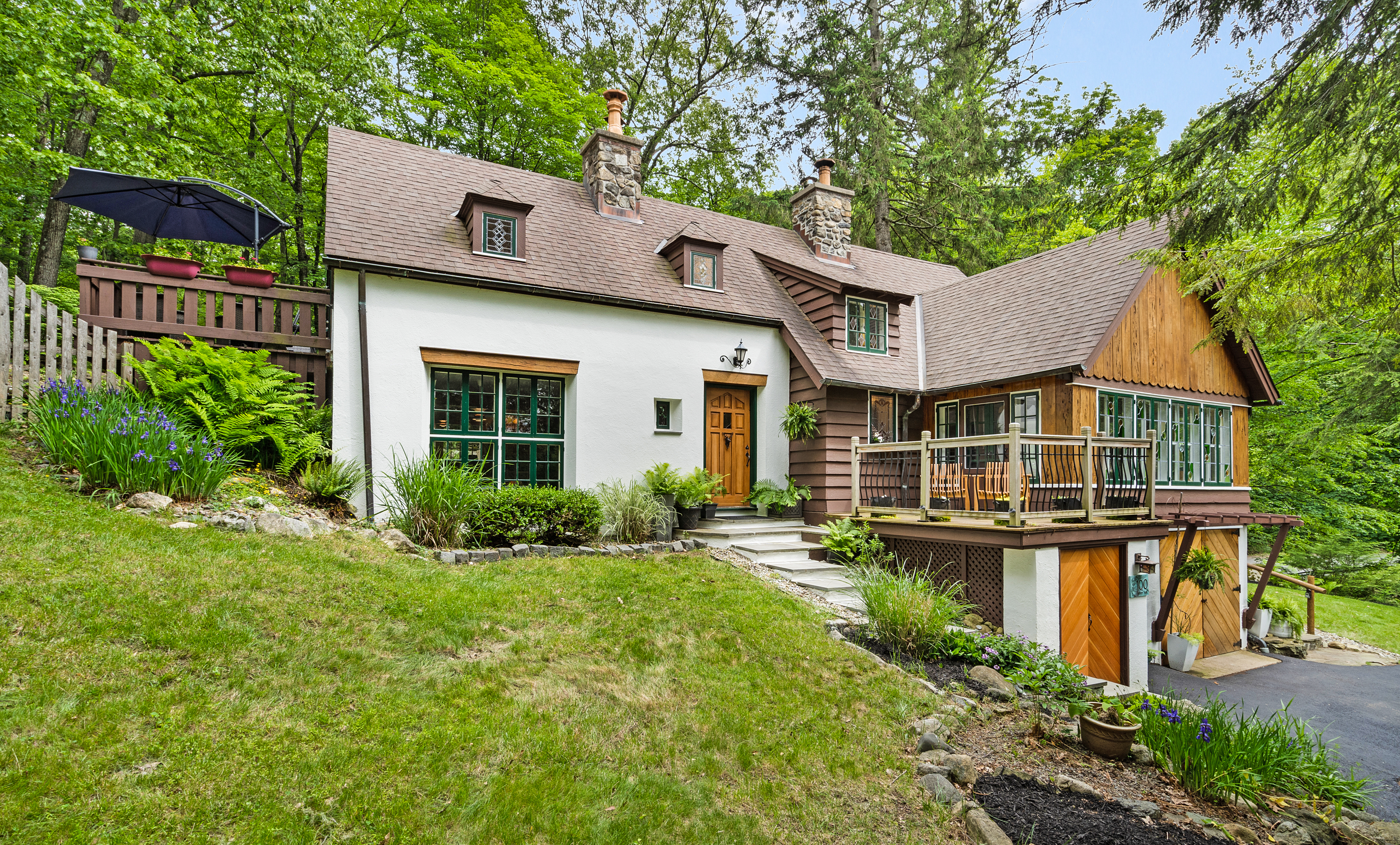 Inside you’ll find a functional layout w/ a recently updated kitchen featuring upgrades like quartz countertops, stainless appliances, two ovens, two sinks, induction cook & vintage Morsø wood stove! Various artisan tile used throughout the entry foyer, kitchen and dining room make for quite the captivating environment! French doors off of the kitchen lead to the first bedroom, offering built-in storage solutions and a charming window seat. The living room is the remarkable crown jewel of this home, featuring a two-story original stone fireplace, vaulted/beamed ceilings and an array of vintage windows w/ stained glass complimenting the lush green views to the outside world. Bedroom 2 and a fully updated bathroom complete the first level. The open wood staircase leads to a functional office loft with original pine floors. Private primary bedroom w/ deck, full updated bathroom, walk-in closet in the hall.