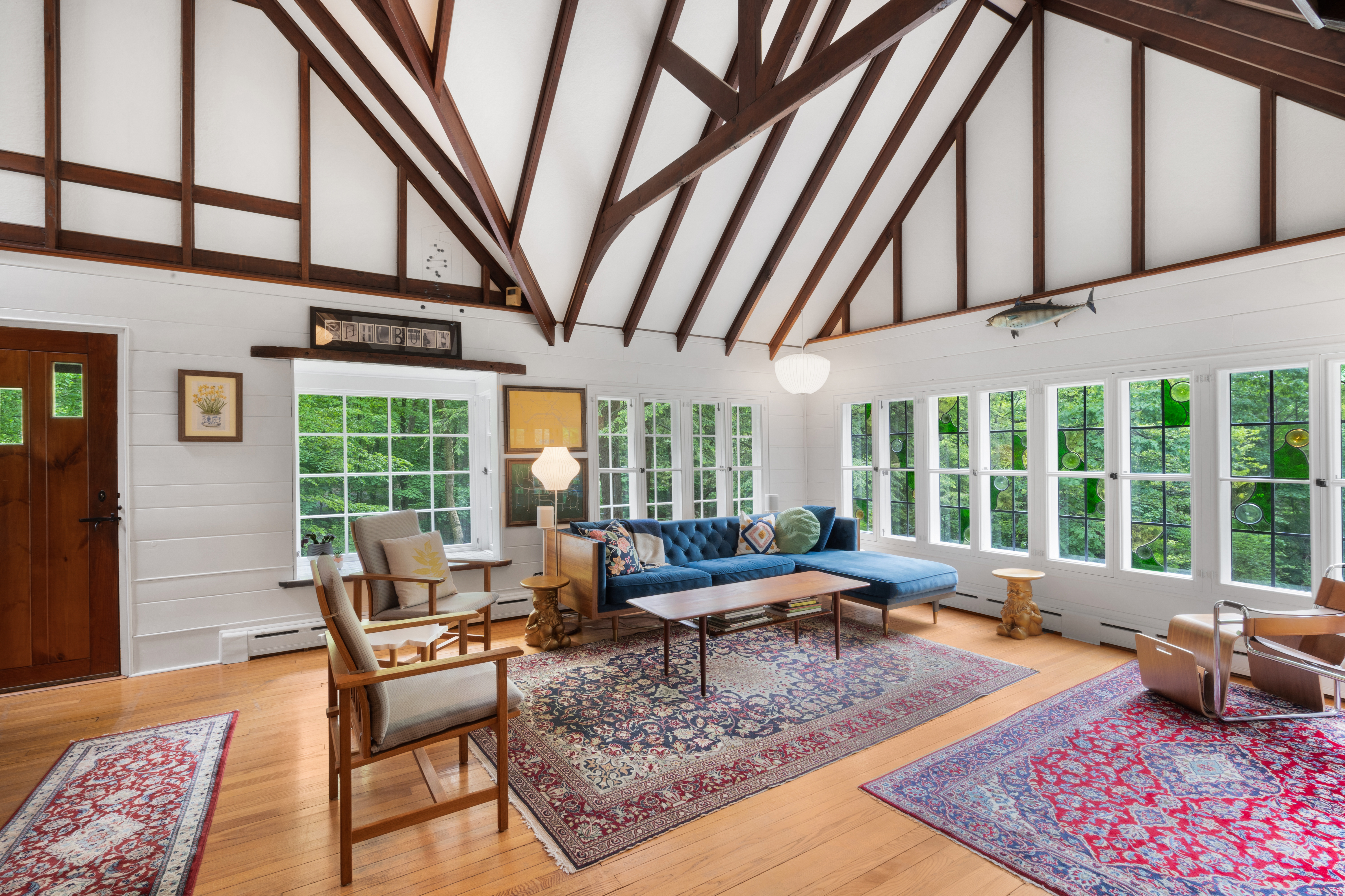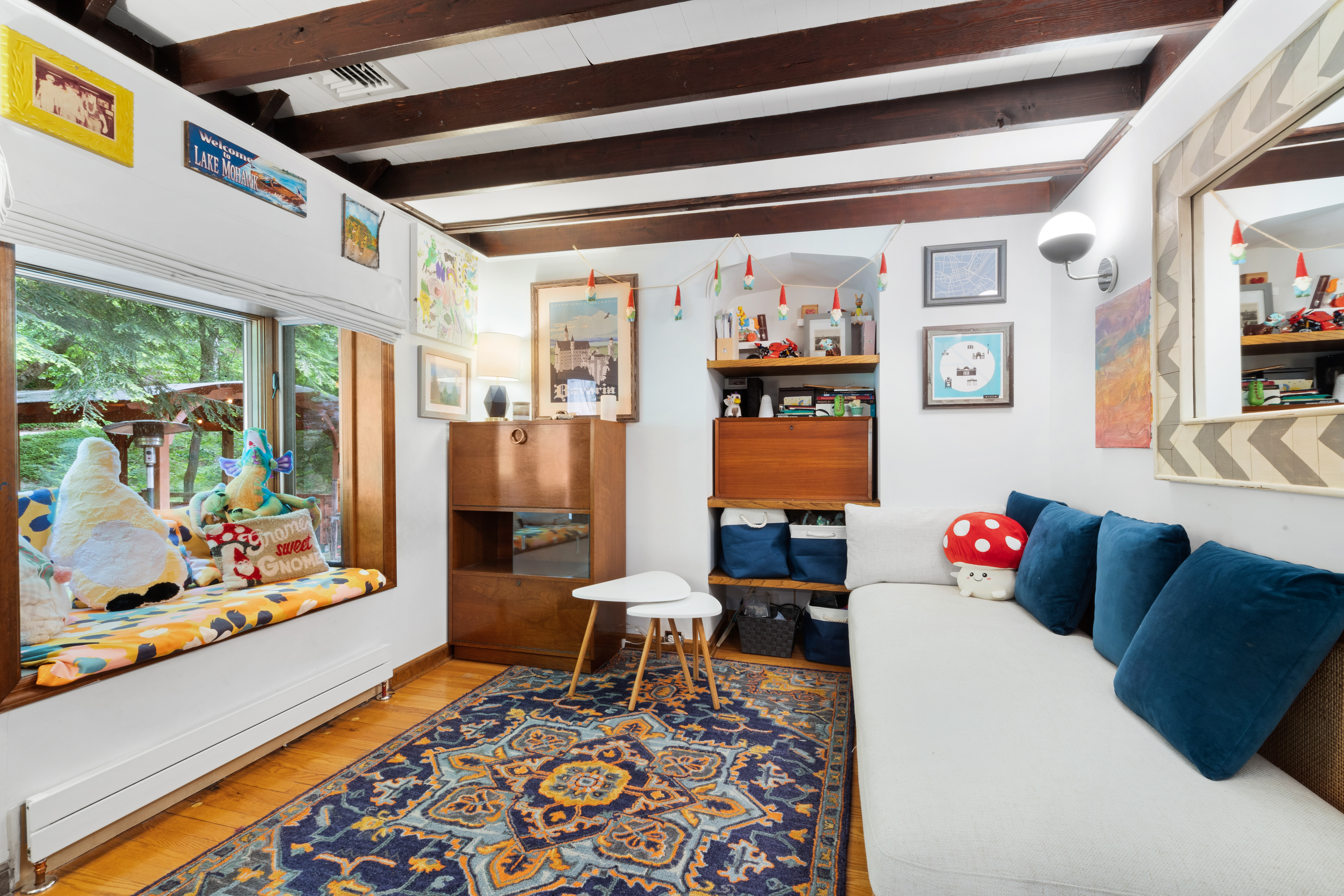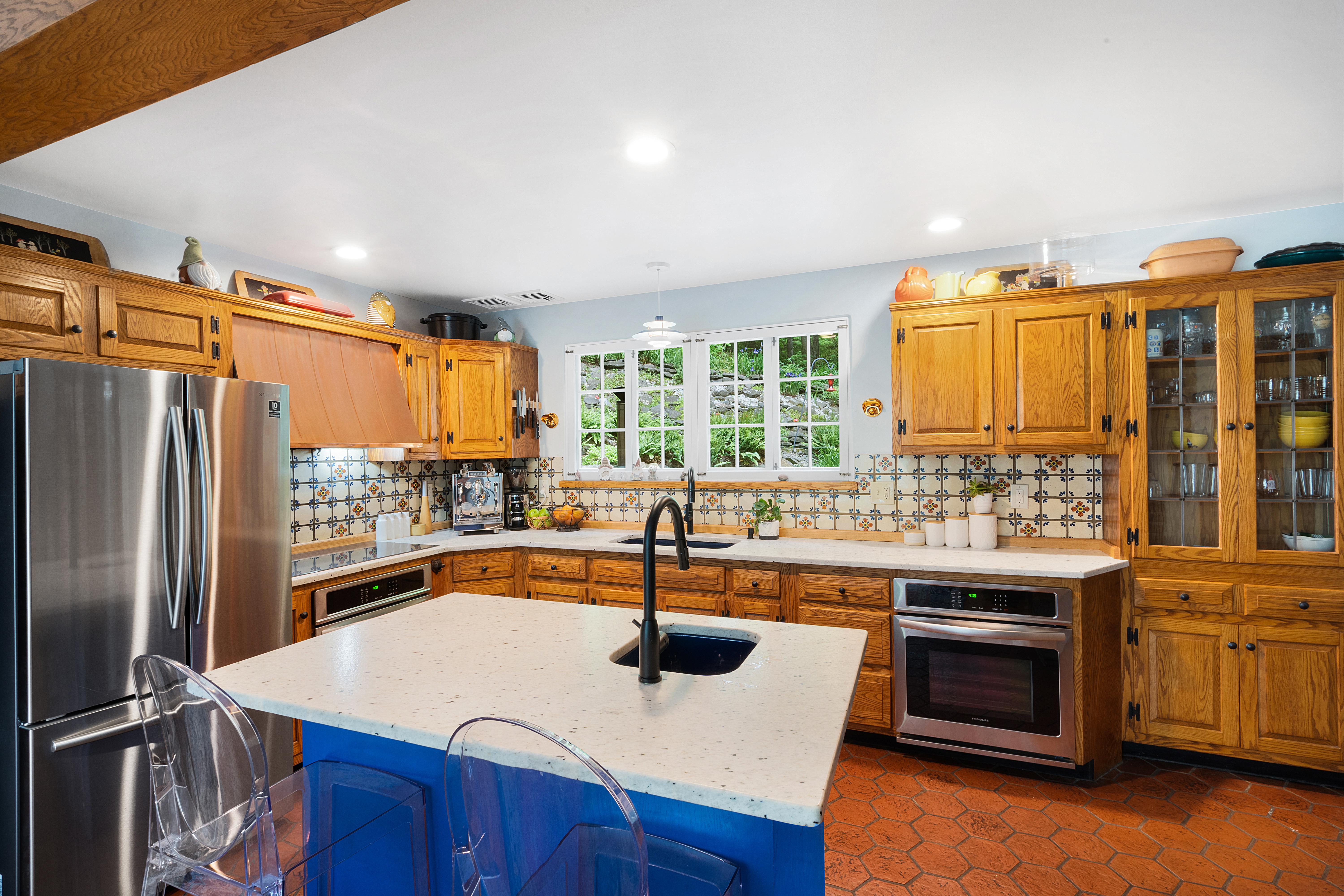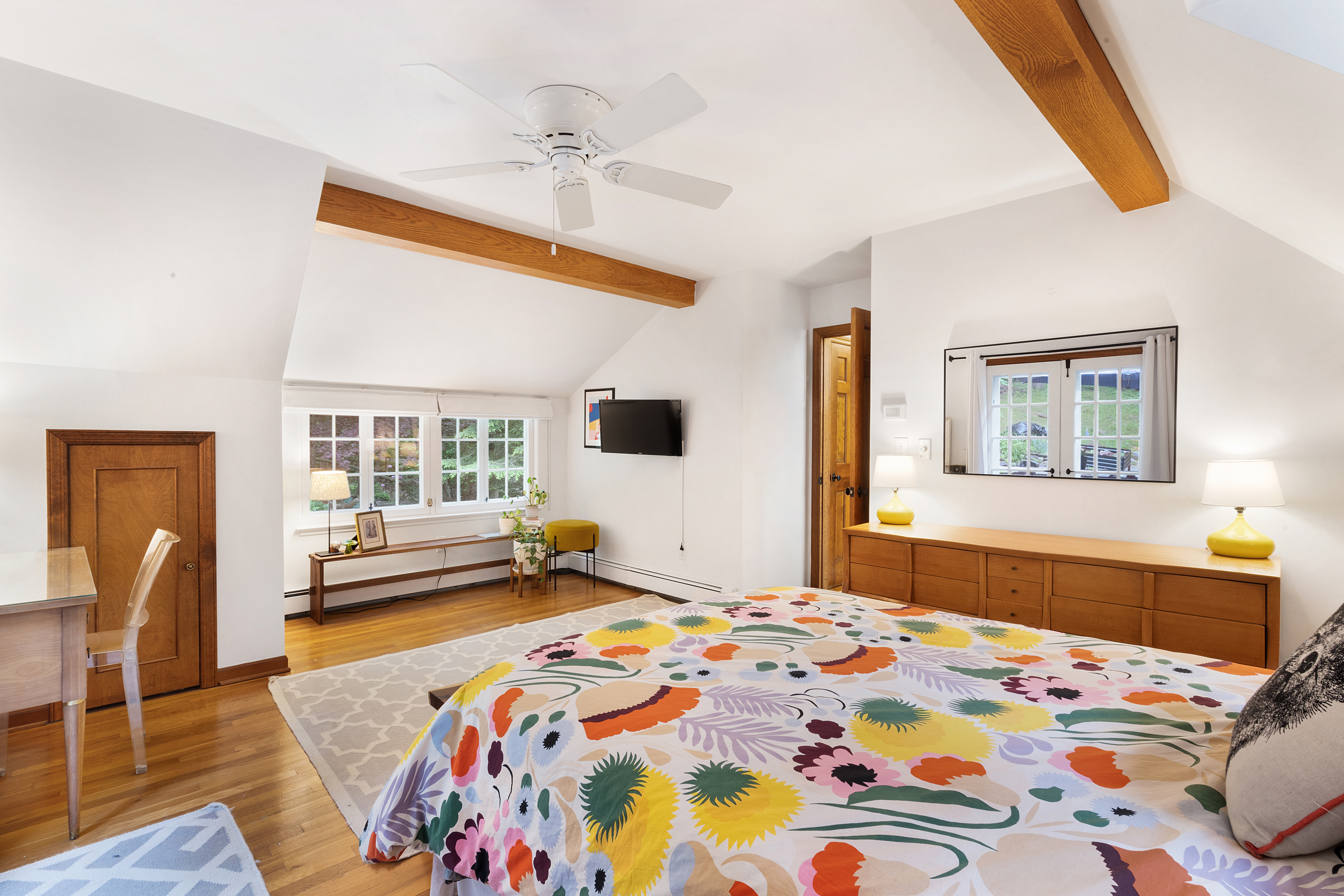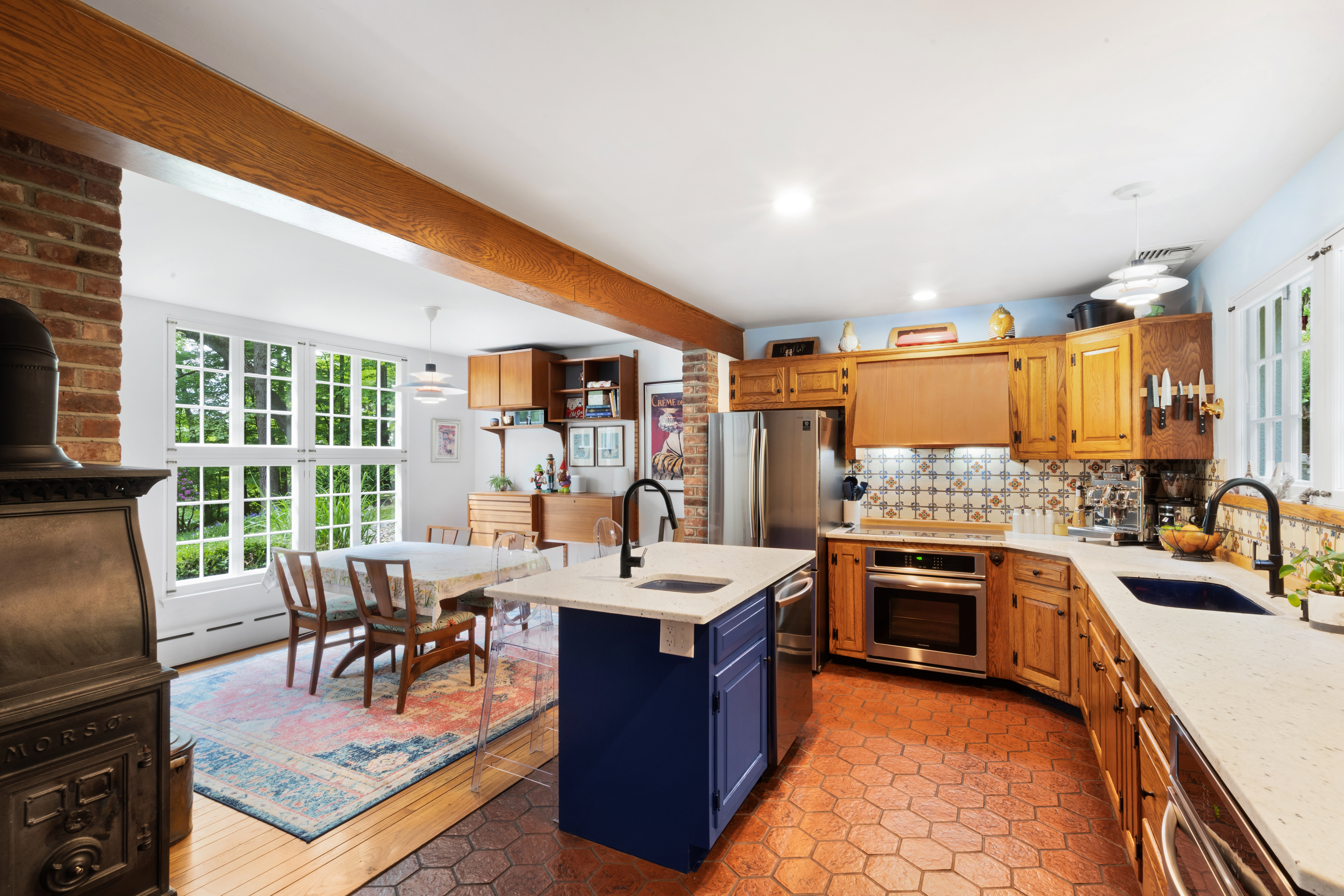 Inside you’ll find a functional layout w/ a recently updated kitchen featuring upgrades like quartz countertops, stainless appliances, two ovens, two sinks, induction cook & vintage Morsø wood stove! Various artisan tile used throughout the entry foyer, kitchen and dining room make for quite the captivating environment! French doors off of the kitchen lead to the first bedroom, offering built-in storage solutions and a charming window seat. The living room is the remarkable crown jewel of this home, featuring a two-story original stone fireplace, vaulted/beamed ceilings and an array of vintage windows w/ stained glass complimenting the lush green views to the outside world. Bedroom 2 and a fully updated bathroom complete the first level. The open wood staircase leads to a functional office loft with original pine floors. Private primary bedroom w/ deck, full updated bathroom, walk-in closet in the hall.