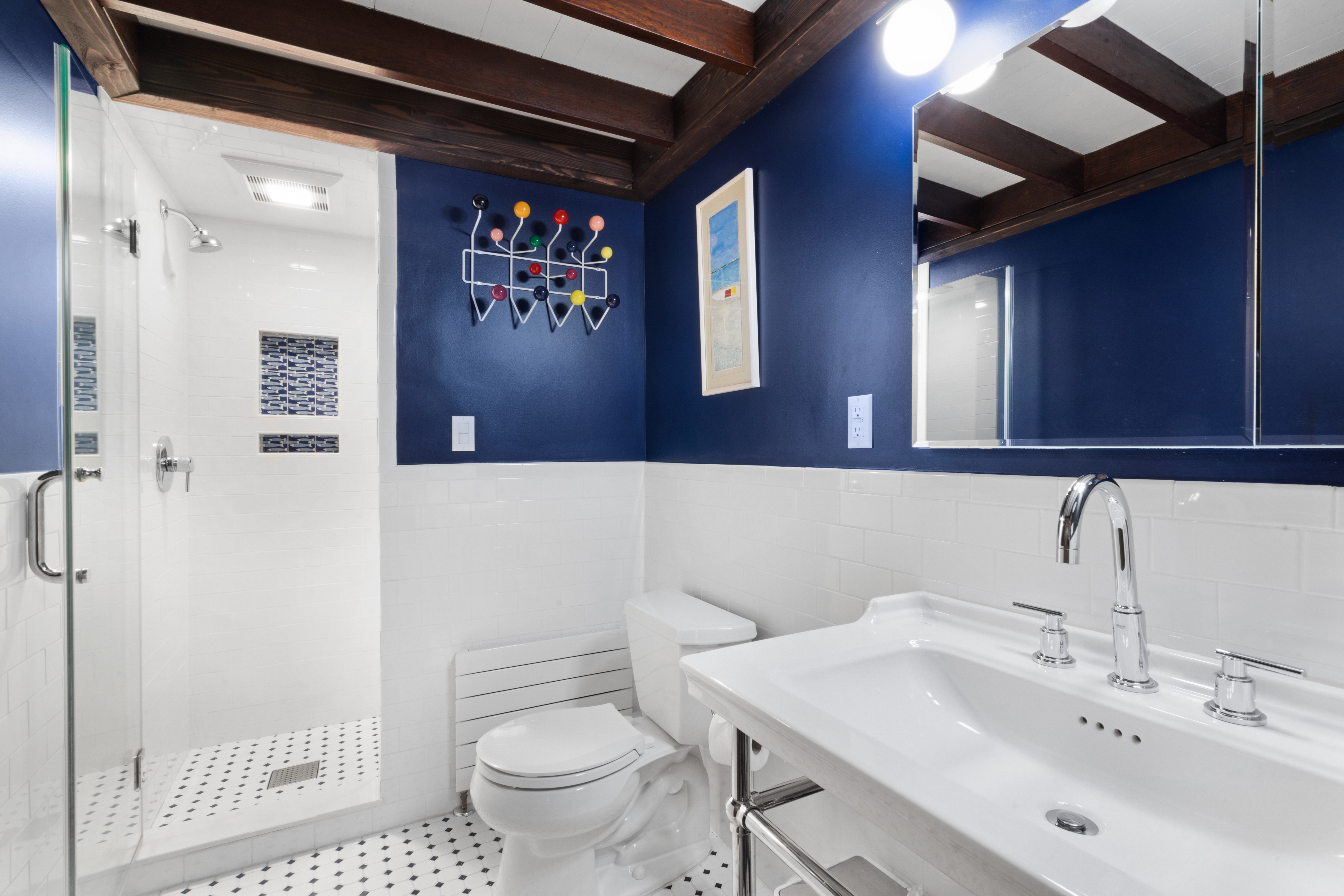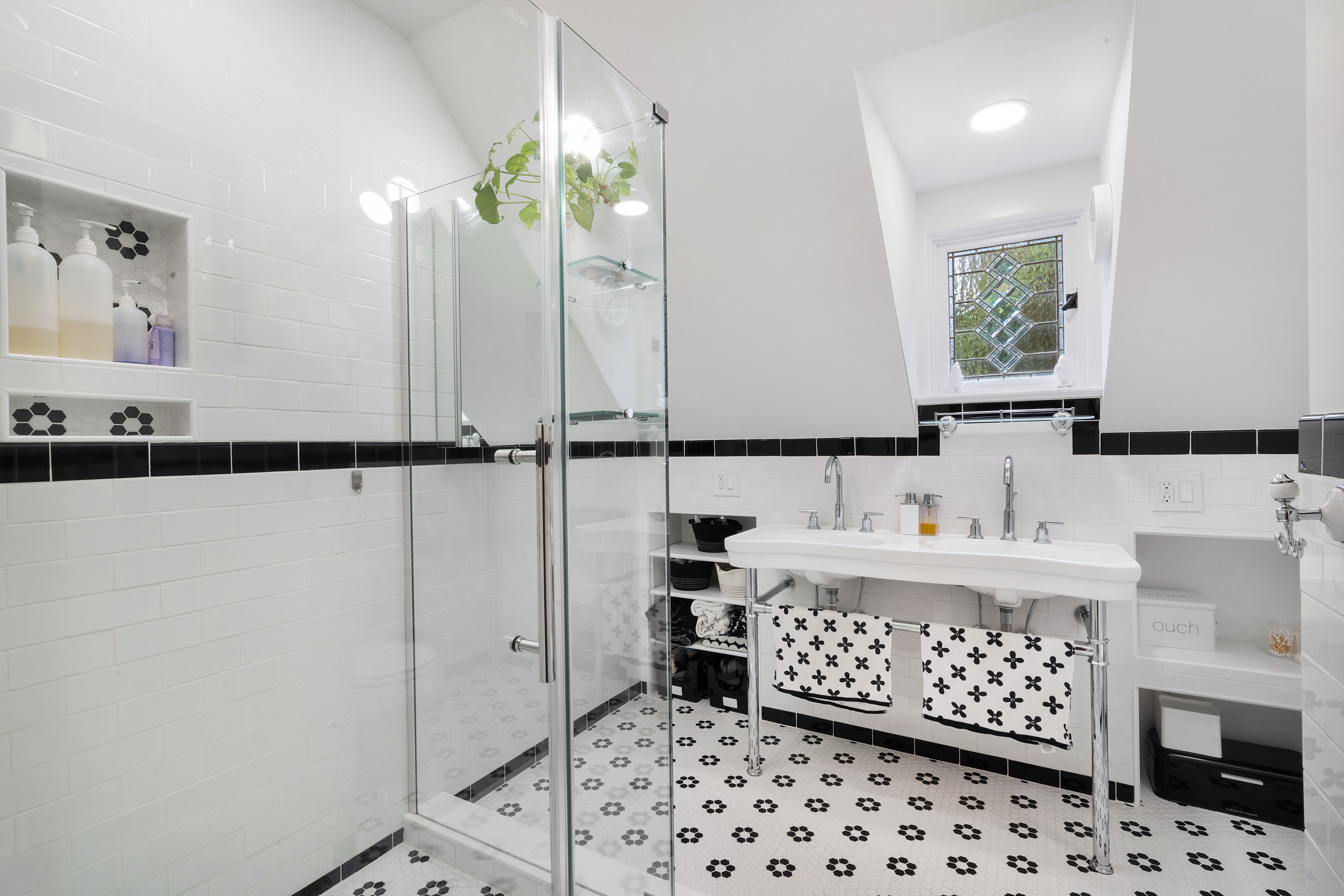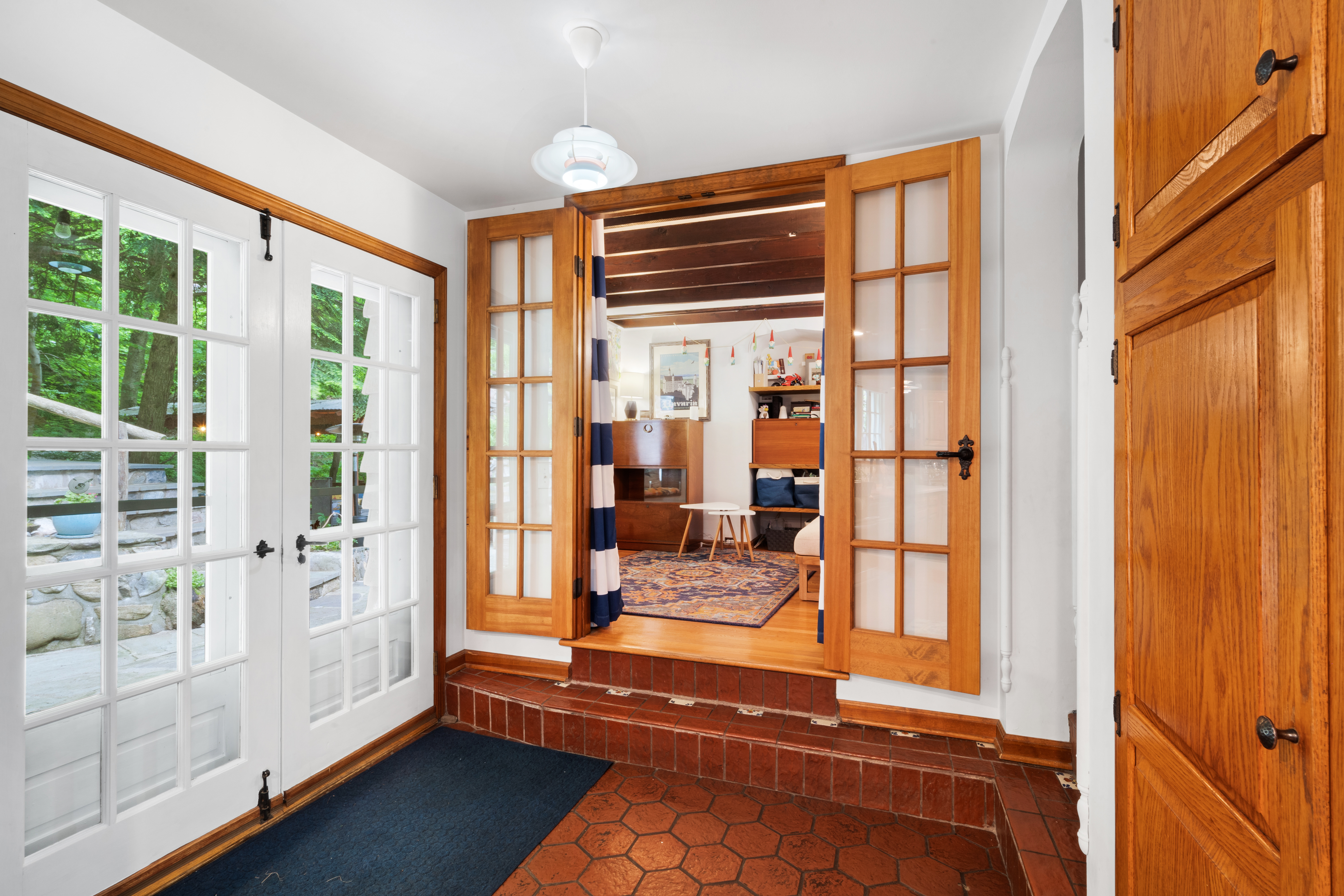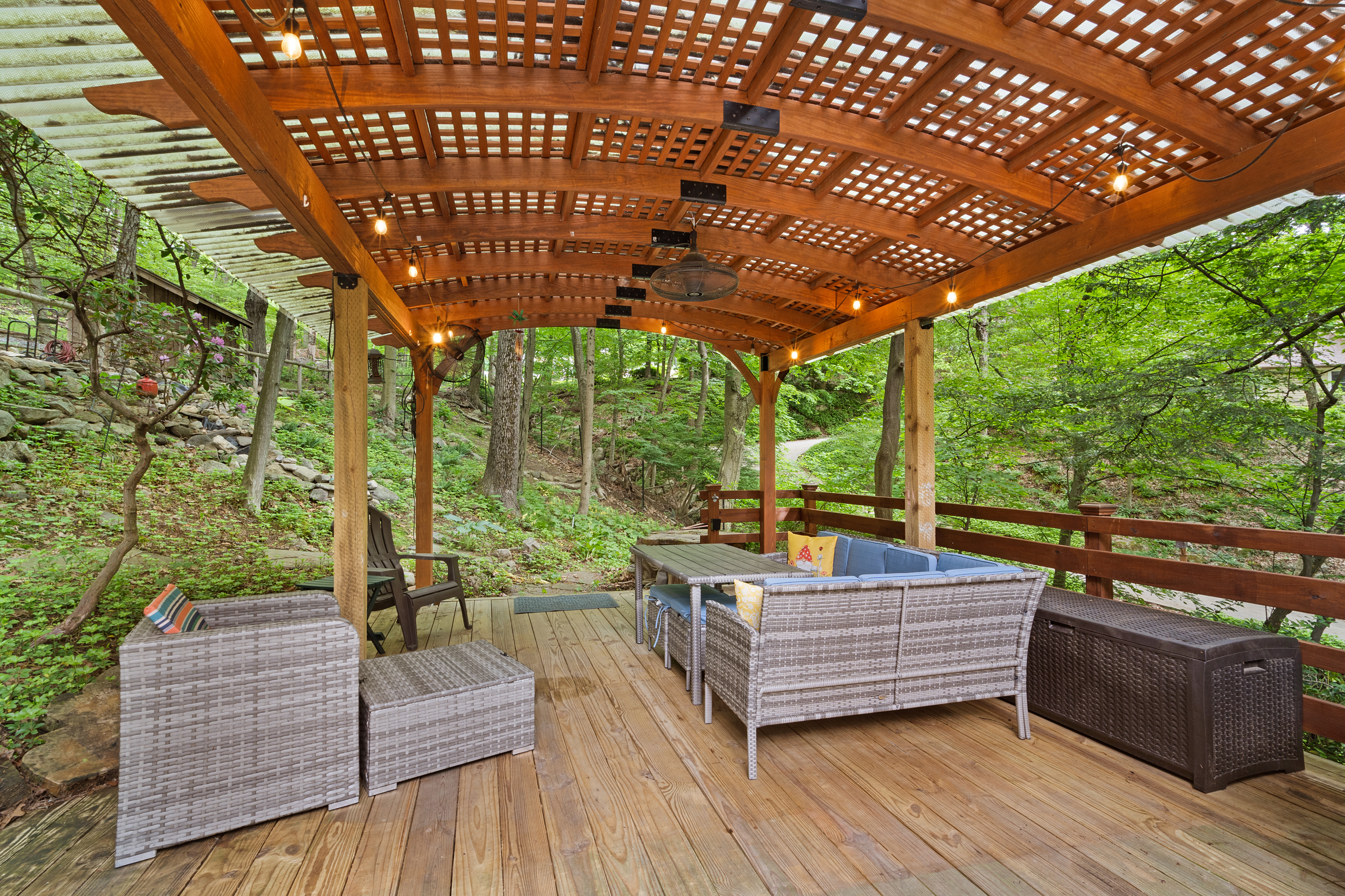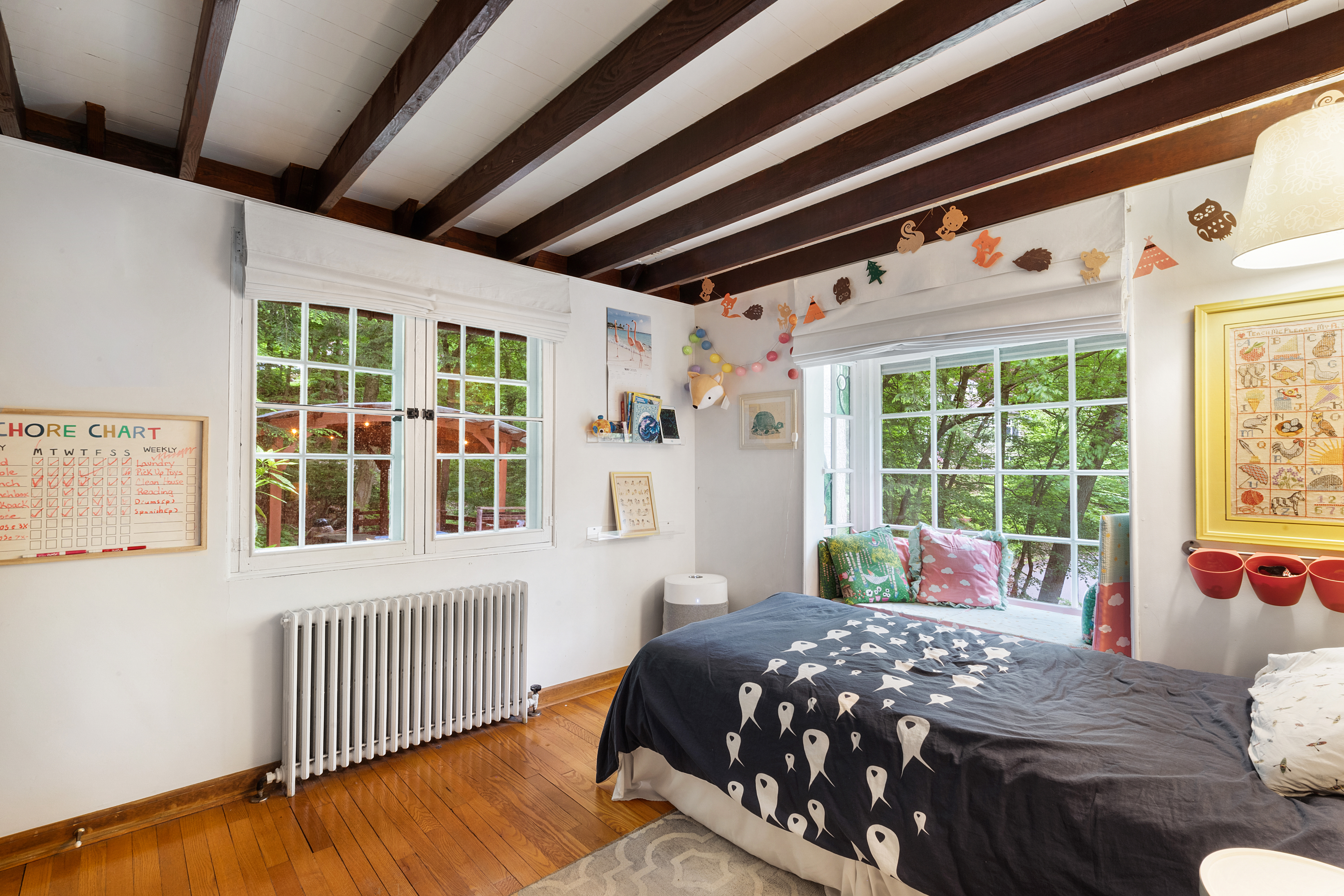 Inside you’ll find a functional layout w/ a recently updated kitchen featuring upgrades like quartz countertops, stainless appliances, two ovens, two sinks, induction cook & vintage Morsø wood stove! Various artisan tile used throughout the entry foyer, kitchen and dining room make for quite the captivating environment! French doors off of the kitchen lead to the first bedroom, offering built-in storage solutions and a charming window seat. The living room is the remarkable crown jewel of this home, featuring a two-story original stone fireplace, vaulted/beamed ceilings and an array of vintage windows w/ stained glass complimenting the lush green views to the outside world. Bedroom 2 and a fully updated bathroom complete the first level. The open wood staircase leads to a functional office loft with original pine floors. Private primary bedroom w/ deck, full updated bathroom, walk-in closet in the hall.