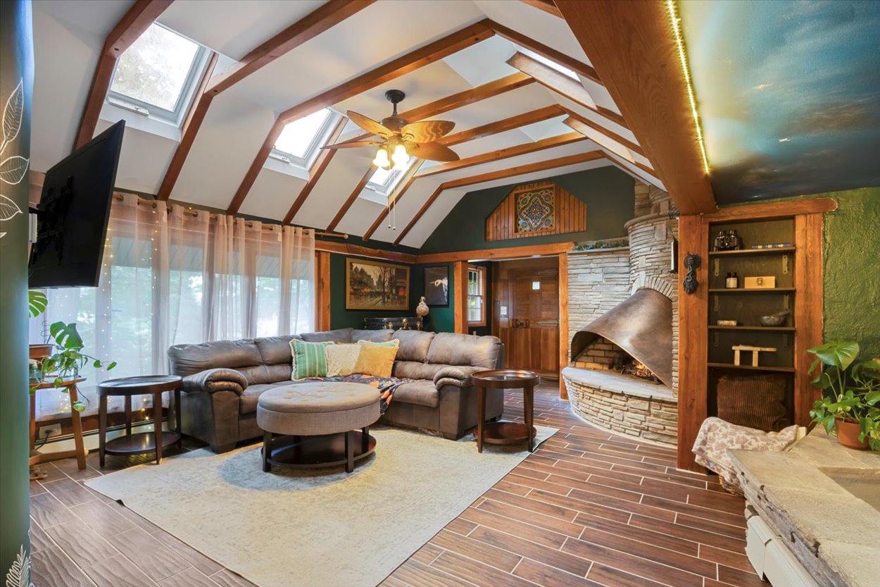 Exterior features include terraced gardens, a hot tub perched for captivating views, and a detached 2-car garage with loft (approved for residential use). Incredible care has been poured into restoring this special property over recent years, including: roofing, siding, HVAC, nat gas, a fully renovated kitchen and bathroom!