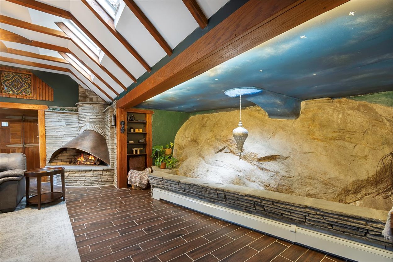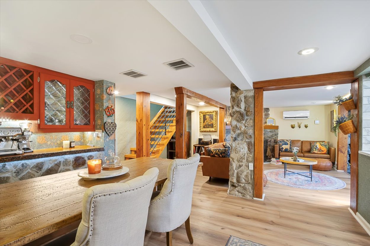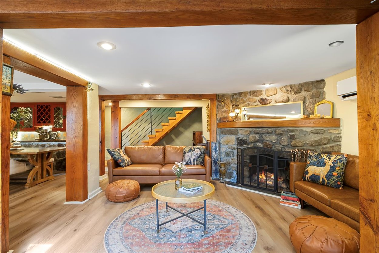 Thoughtfully designed with three distinct levels of living space, two living areas, 3-4 bedrooms, a one of a kind primary suite and two full bathrooms, provides ample space to entertain as well as relax and enjoy the peaceful surroundings. The home itself is filled with distinctive elements, such as a natural rock atrium, a round stone stairwell, and three unique fireplaces. The first level features a living room with an original stone fireplace, dining room, kitchen, family room, full bathroom, patio room, laundry room, and utility room.