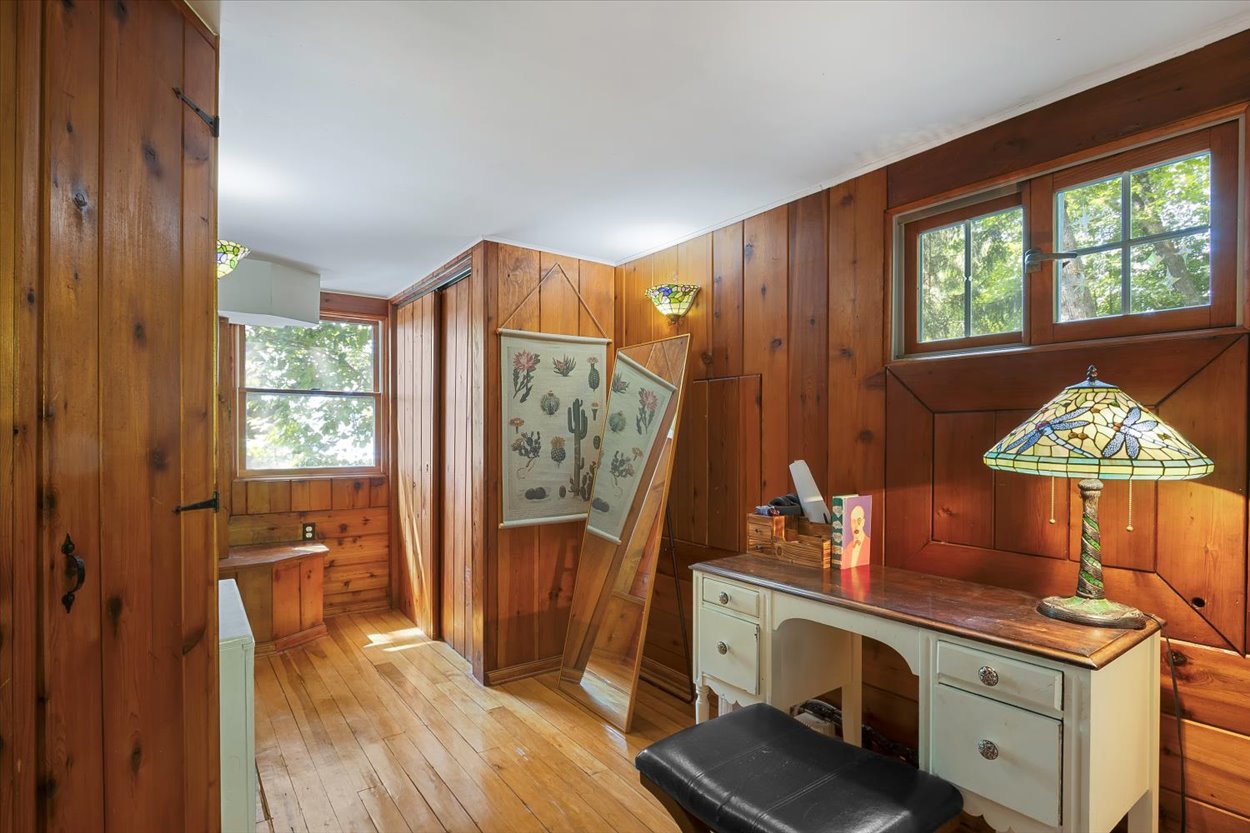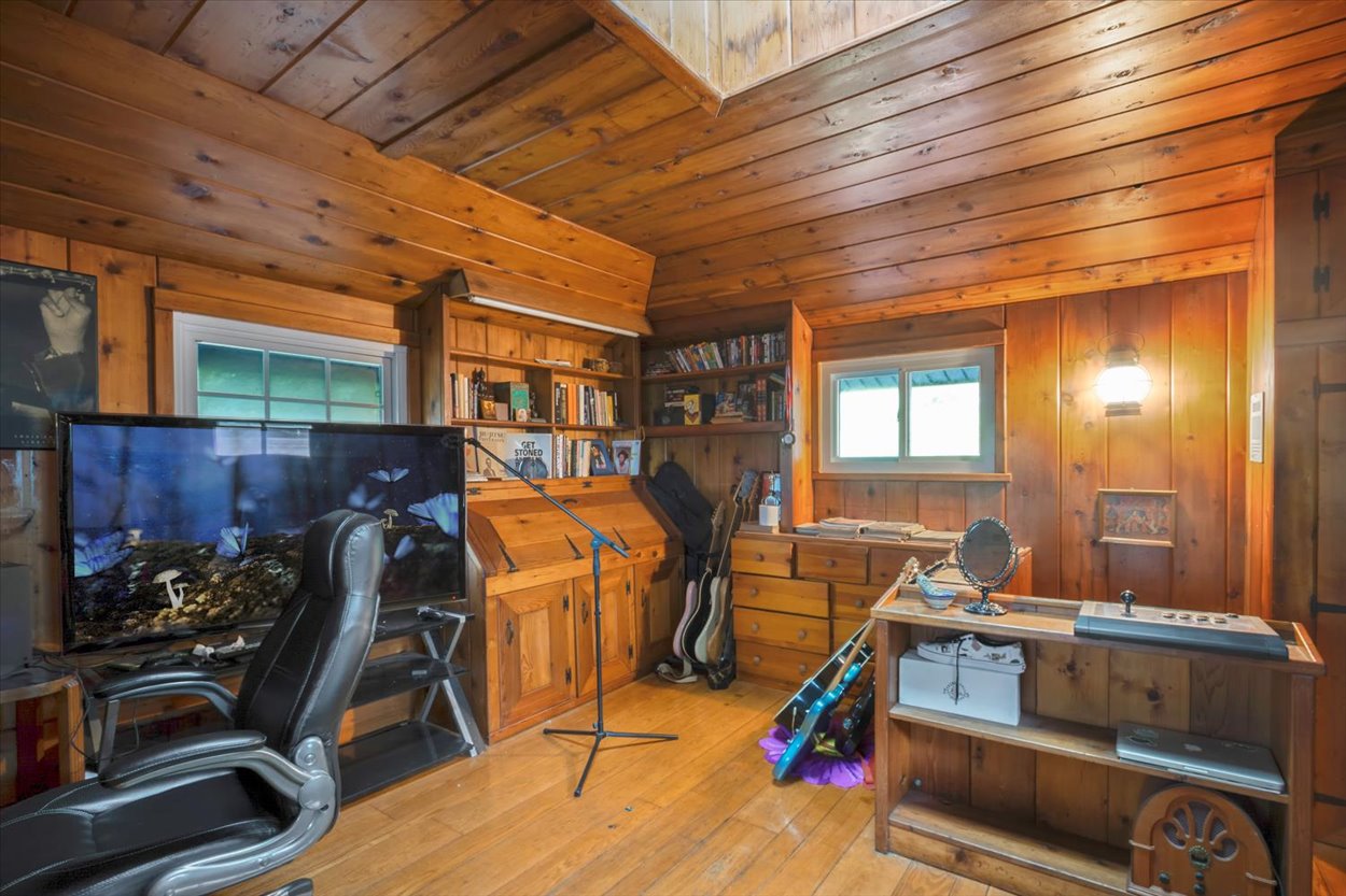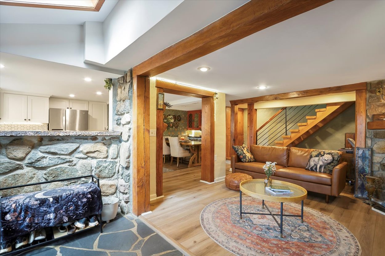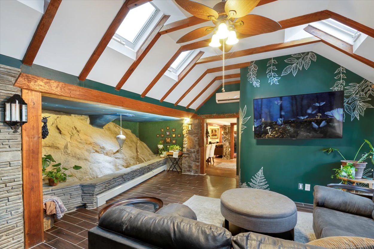 Thoughtfully designed with three distinct levels of living space, two living areas, 3-4 bedrooms, a one of a kind primary suite and two full bathrooms, provides ample space to entertain as well as relax and enjoy the peaceful surroundings. The home itself is filled with distinctive elements, such as a natural rock atrium, a round stone stairwell, and three unique fireplaces. The first level features a living room with an original stone fireplace, dining room, kitchen, family room, full bathroom, patio room, laundry room, and utility room.